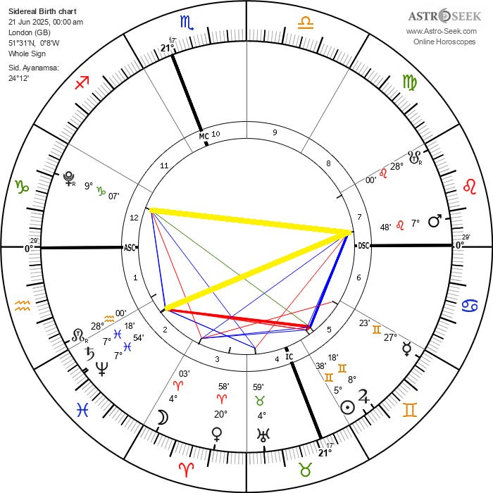 In May, Joni Patry mentioned an alignment around 21 June that could trigger treacherous events: Mars in Leo forming a 6/8 relationship (quincunx) with Pluto in Capricorn, and an another 6/8 relationship with the Saturn-Neptune conjunction in Pisces [2]. When two sets of planets each form a 6/8 relationship with a mutual planet (shown in the chart below by the yellow “V”), it creates what astrologers call a Finger of God, or Yod. This configuration can signify something karmic and disharmonious. Notably, Saturn and Neptune at 7° Pisces were positioned close to Scheat at 5° Pisces.
